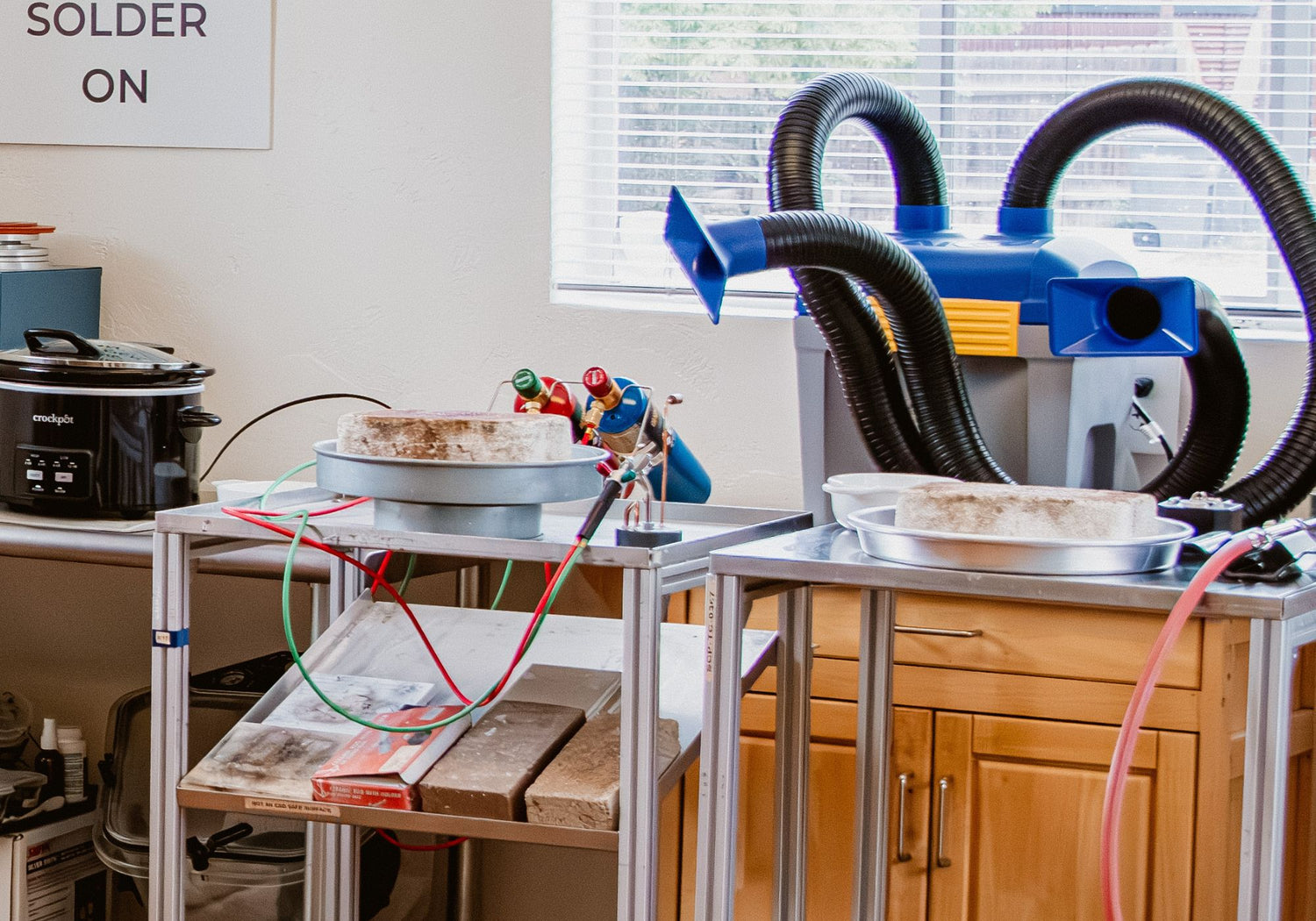 Metalsmithing can be dangerous, especially when care is not taken with particles, chemicals, and fumes. We have state-of-the-art ventilation for ALL torch classes (whether its butane, propane, or acetylene), we provide aprons to protect your clothing, safety glasses to protect your eyes, gloves to protect your hands, and KN95 masks to protect your lungs from harmful dust caused by polishing compounds and sanding.
